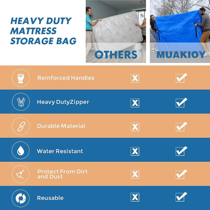- Mattress Protection: MUAKIOY queen mattress bags for moving made of all-new thick Pe-Trap wear resistance material, heavy-duty waterproof mattress moving bag protects your mattress, sturdy enough to withstand repeated wearing, rubbing, and scrapping while moving
